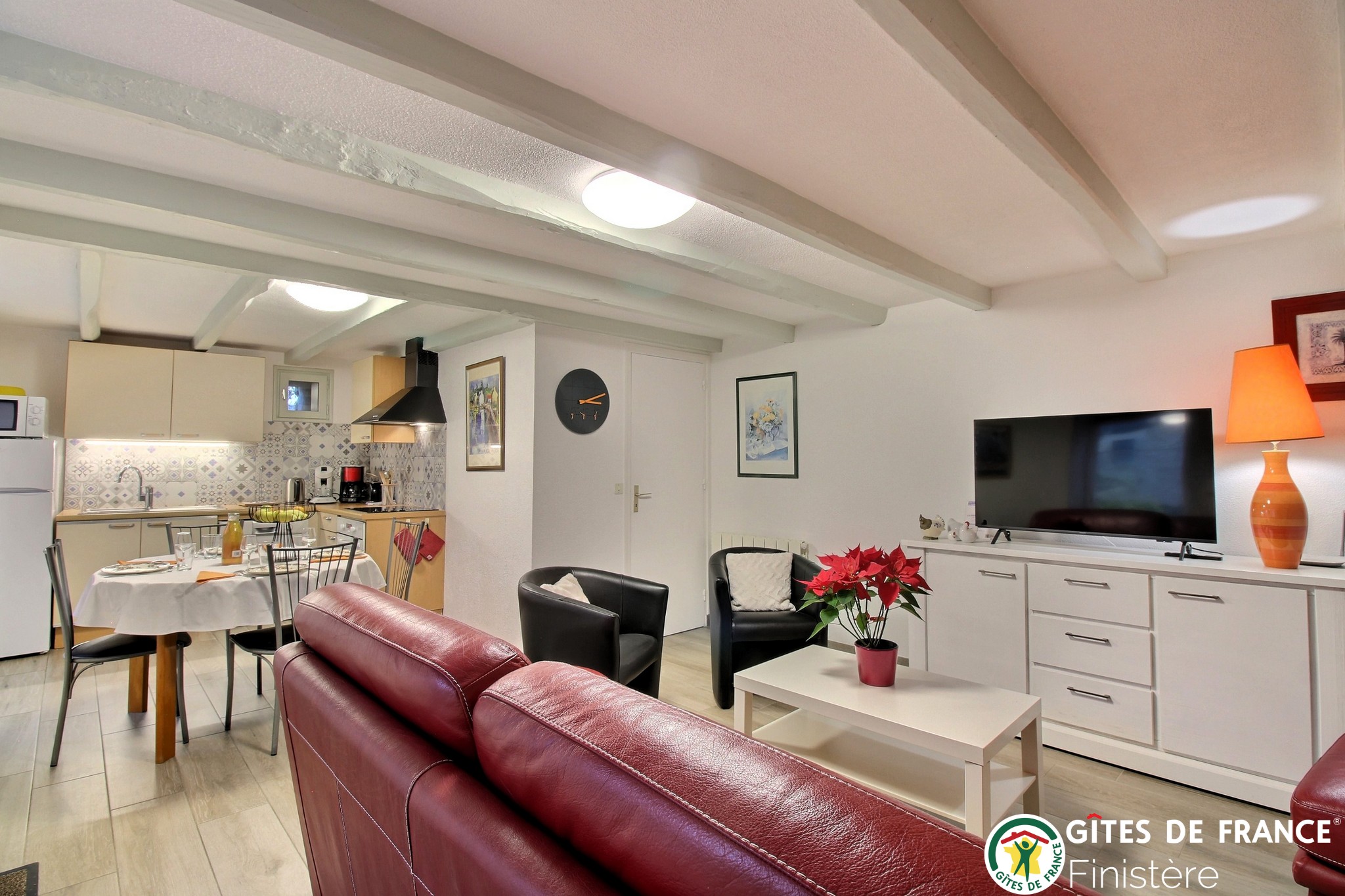 Côté séjour : canapé et fauteuils, téléviseur, lecteur DVD.